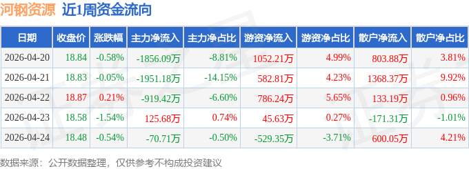 资金流向数据方面,本周河钢资源主力资金算计净流出4671.72万元,游资资金算计净流入1937.54万元,散户资金算计净流入2734.18万元。本周资金流向一览见下表: